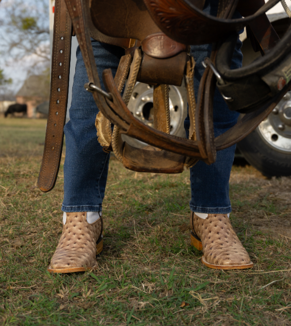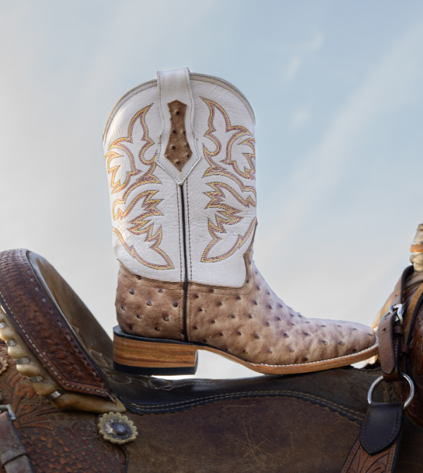 The Texas Hold’em boot in Orix is made with bovine leather featuring an ostrich-print texture. It’s designed with a square toe and traditional stitching for a classic western style.