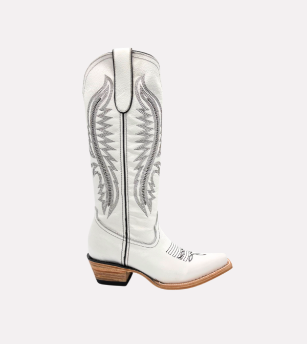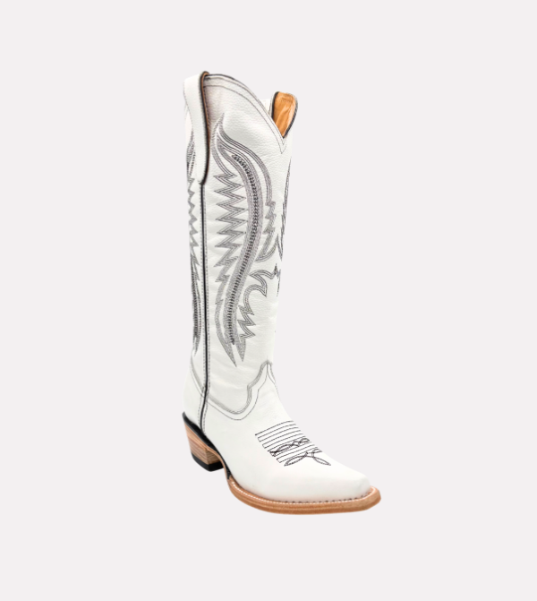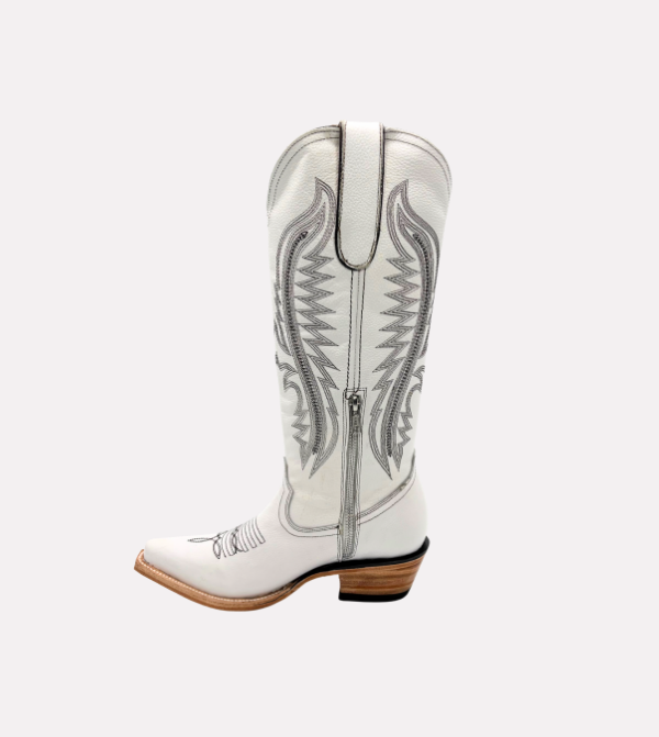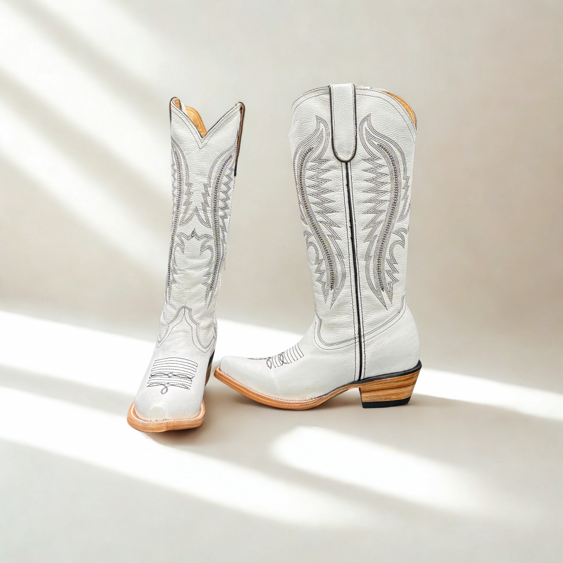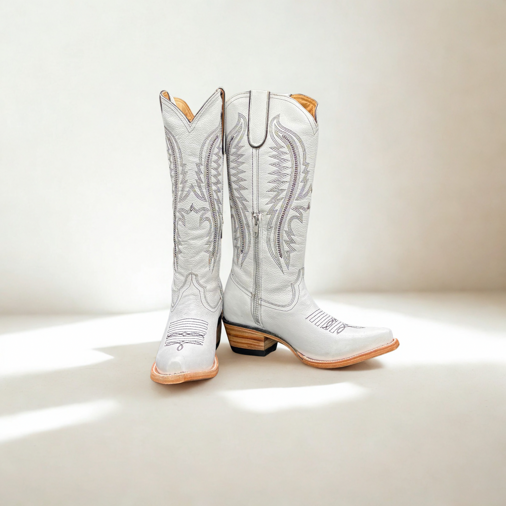 The Pearl boot delivers a refined Western silhouette with premium craftsmanship. It features a tall shaft with detailed stitching, a functional side zipper for easy wear, and a smooth white leather finish designed for durability and versatility.