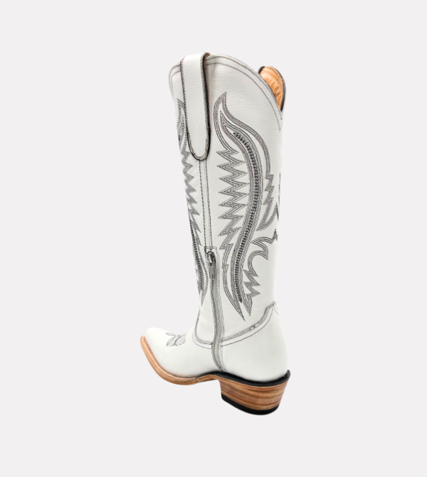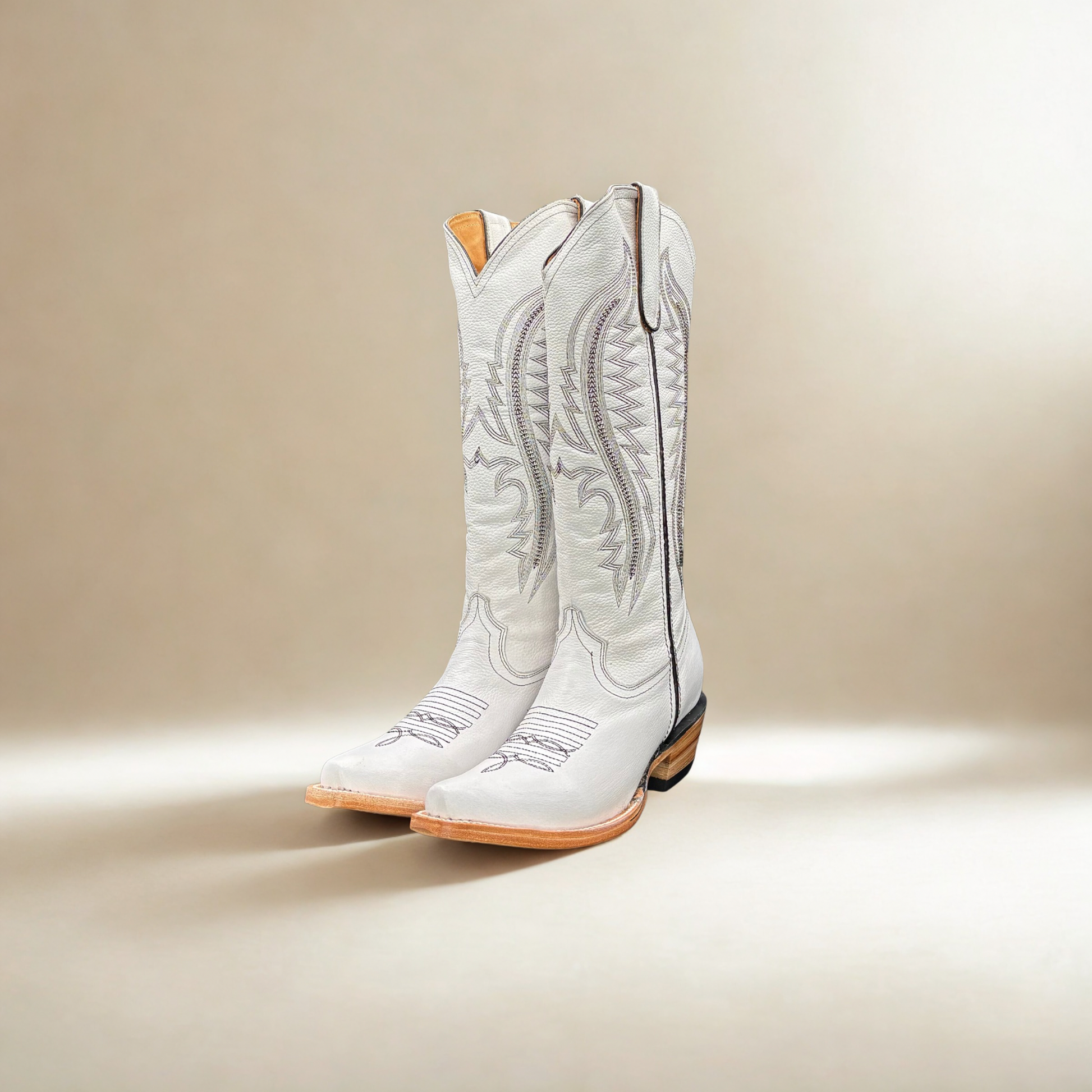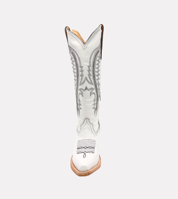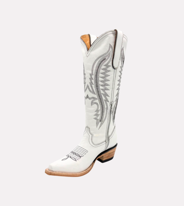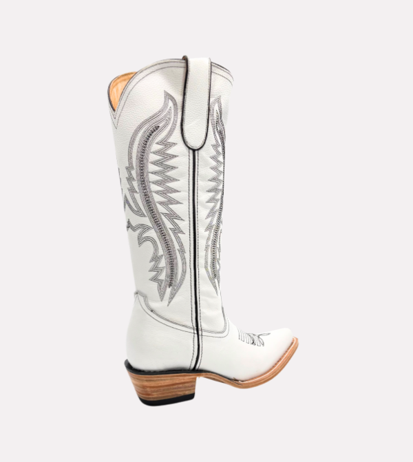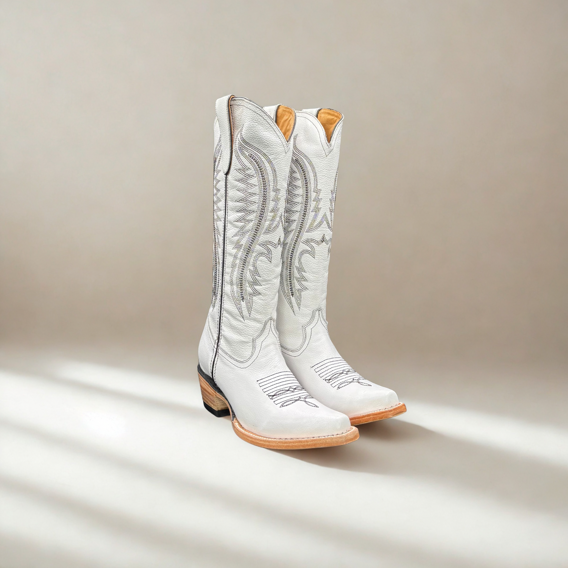 The Pearl boot delivers a refined Western silhouette with premium craftsmanship. It features a tall shaft with detailed stitching, a functional side zipper for easy wear, and a smooth white leather finish designed for durability and versatility.