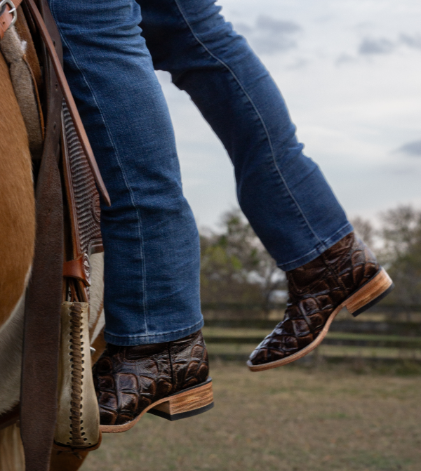 The Wildwood boot features a brown bovine leather with a printed Pirarucu texture, replicating the distinctive scale pattern of the Pirarucu fish. It’s finished with traditional embroidery for a classic western look.